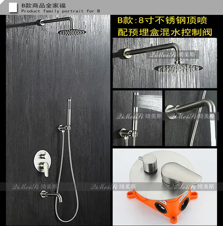 - 颜色分类: E12寸不锈钢淋浴花洒套装 A8寸不锈钢淋浴花洒套装 B8寸不锈钢淋浴底盒花洒套装 C10寸不锈钢淋浴花洒套装 D10寸不锈钢淋浴底盒花洒套装 F12寸不锈钢淋浴底盒花洒套装 G8寸ABS淋浴花洒套装 H8寸ABS淋浴底盒花洒套装 不锈钢花洒座 不锈钢三功能预埋盒混水阀